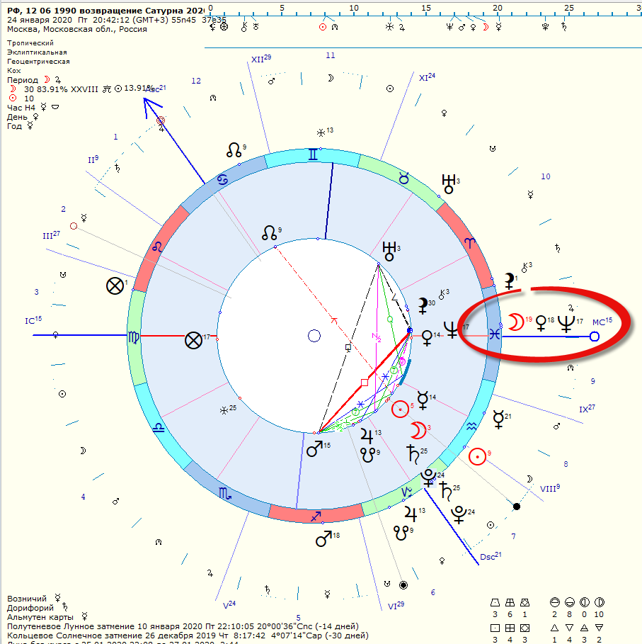 Немного конспирологии, о том, кто у власти в РФ… карта для размышления, возврат Сатурна в карте 12 06 1990 года, как уточняющая событийный аспект в данную тридцатилетку. Стоит заметить, что показанное прогрессивное движение весьма информативно. Начало — Новолуние, 2020 описываемый период — Изменения в Конституции РФ, смена правительства, следом значимое событие — ингрессия прогрессивной Луны в Рыбы — начало войны, и в рыбах стеллиум Венеры и Нептуна — еще одно эпохальное событие, но природа этих планет такова, что может быть скрыта и не проявлена. Но учитывая что соединение это произошло именно в октябре 2023, надо просто подумать — а что там скрывают? Или — так, какие события октября соответствуют данном соединению? Разве что еврейские погромы и общее помешательство … Но в таком случае — это клинический случай для всего общества